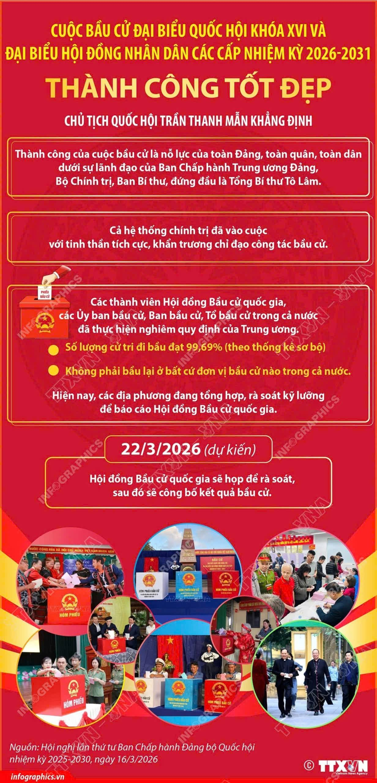 Với sự chuẩn bị chu đáo, tổ chức chặt chẽ và tinh thần trách nhiệm cao của cả hệ thống chính trị, cùng sự hưởng ứng tích cực của cử tri, cuộc bầu cử đại biểu Quốc hội khóa XVI và đại biểu HĐND các cấp nhiệm kỳ 2026-2031 trên địa bàn tỉnh Thanh Hóa đã diễn ra an toàn, đúng pháp luật. Tỷ lệ cử tri tham gia bỏ phiếu đạt 99,94%, góp phần quan trọng vào thành công chung của cuộc bầu cử.